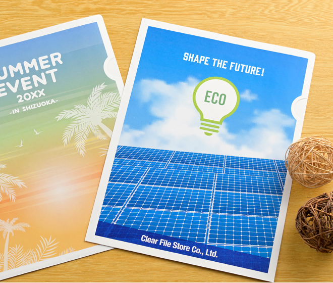 上質紙でつくられた、環境にやさしいエコなファイルです。一般的なクリアファイルと同様、A4サイズの資料が入る仕様となっています。